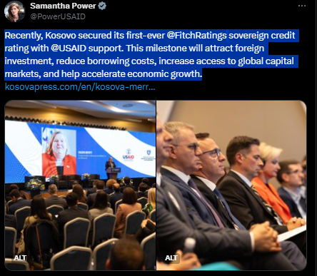 “Kohët e fundit, Kosova siguroi për herë të parë @FitchRatings vlerësimi i kredisë sovrane me @USAID mbështetje. Ky moment historik do të tërheqë investime të huaja, do të reduktojë kostot e huamarrjes, do të rrisë aksesin në tregjet globale të kapitalit dhe do të ndihmojë në përshpejtimin e rritjes ekonomike”, ka shkruar ajo në Twitter.