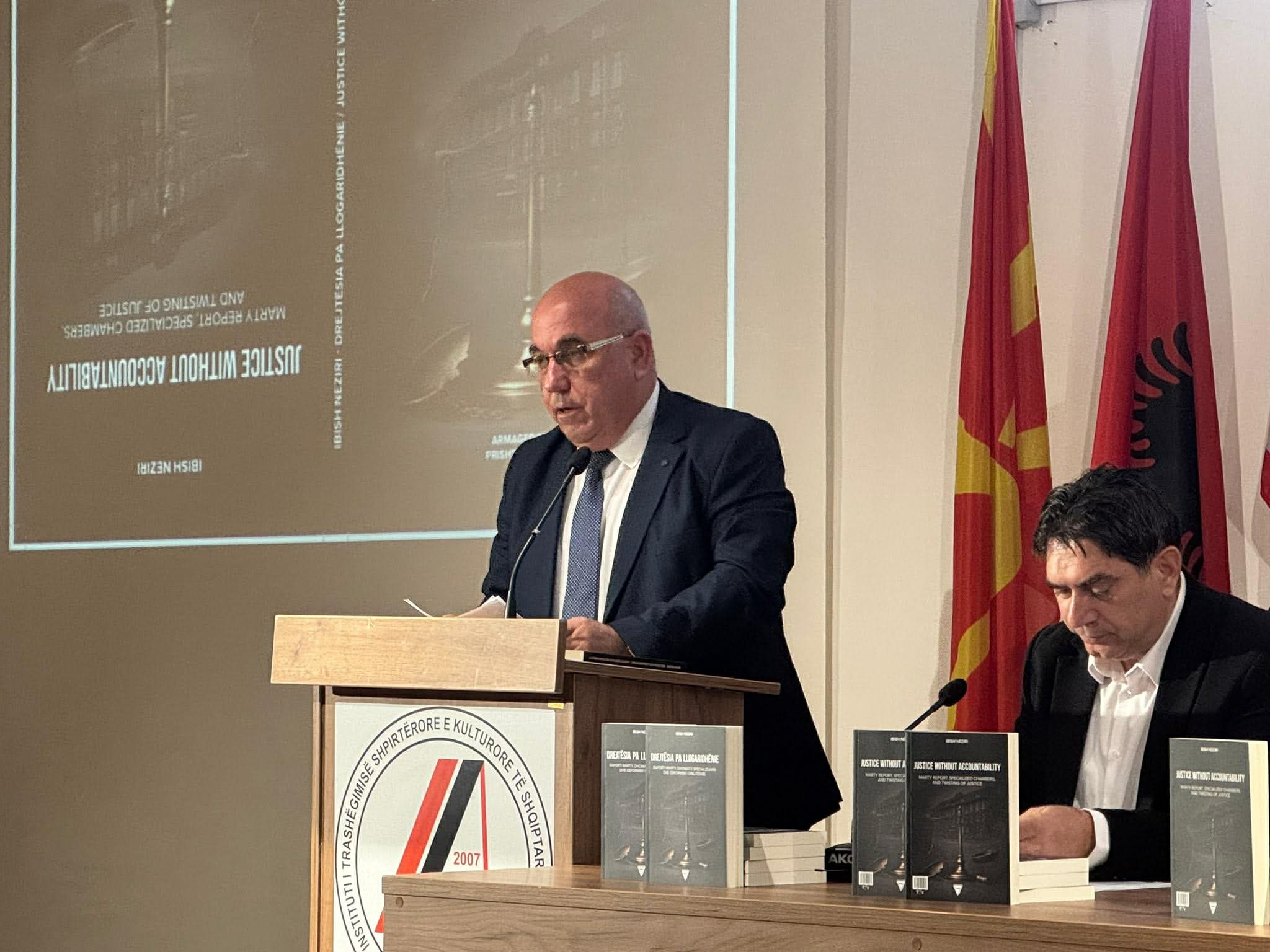 Libri që po promovojmë sot, këtu në Shkup, ,,Drejtësia pa llogaridhënie” i autorit Ibish Neziri, botuar në dy gjuhë: shqip – anglisht, për aq sa di unë është libri i dytë, pas atij të Akademik Arsim Bajramit ,,Gjykata Speciale  – Midis të vërtetës dhe mashtrimeve” (Prishtinë, 2025) që merren me problemin e Dhomave të Specializuara të Kosovës në Hagë.