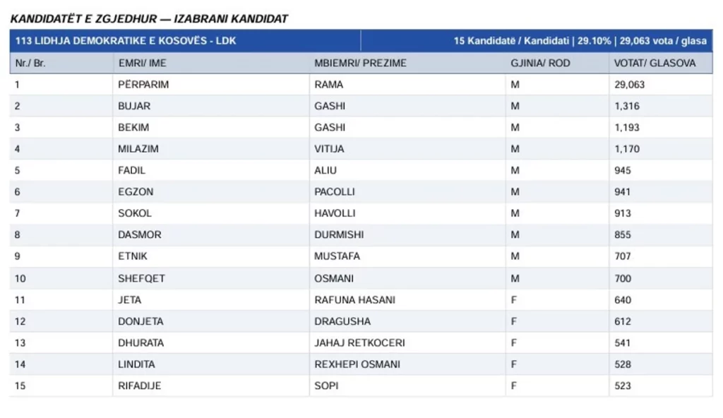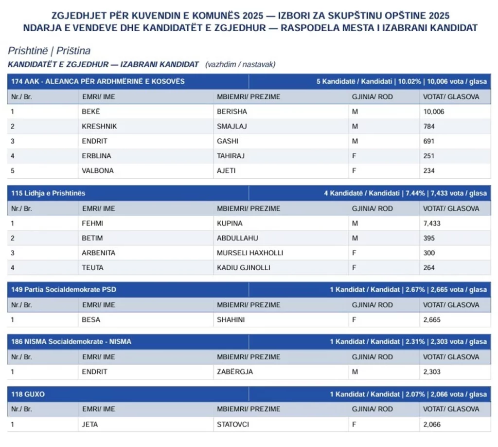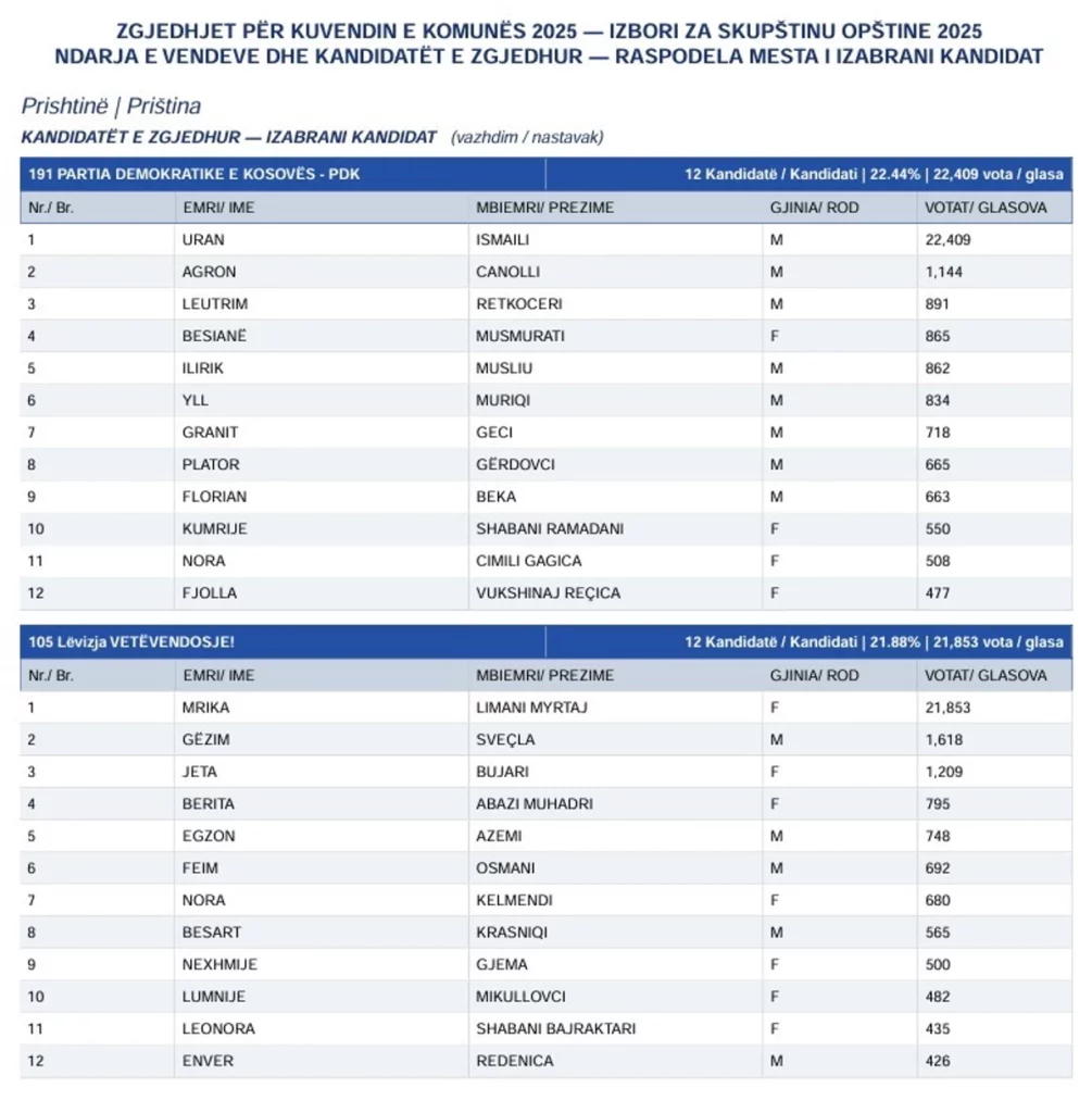 Më poshtë lista e kandidatëve që kanë fituar ulëse në Kuvendin e Prishtinës.