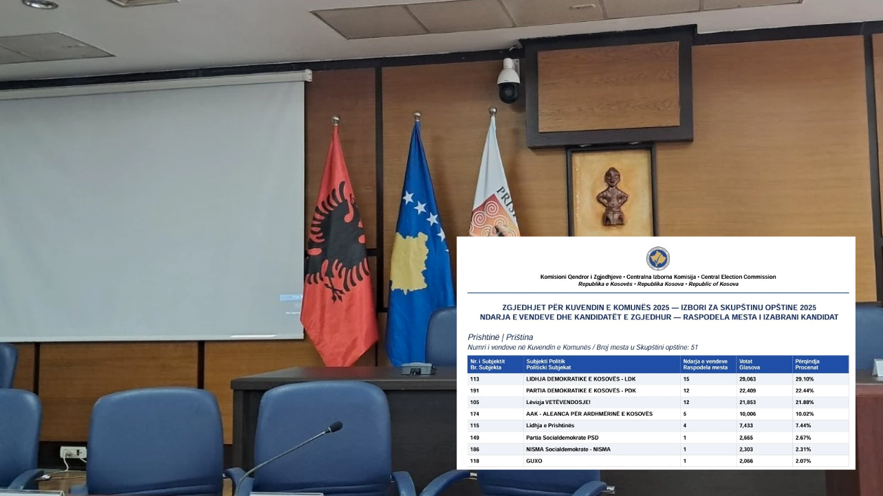 Përbërja e re e Kuvendit Komunal të Prishtinës: LDK 15 asamblistë, PDK 12, LVV 12, AAK 5