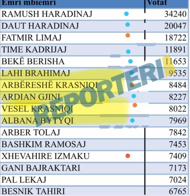 Ramush Haradinaj deri tash ka 34 mijë e 240 vota, Daut Haradinaj 20 mijë e 47 vota, Time Kadriaj 11 mijë e 891 vota, Fatmir Limaj, 18 mijë e 722 vota, Bekë Berisha 11 mijë e 653 vota, Arbërsha Krasniqi 8 mijë e 484 vota.