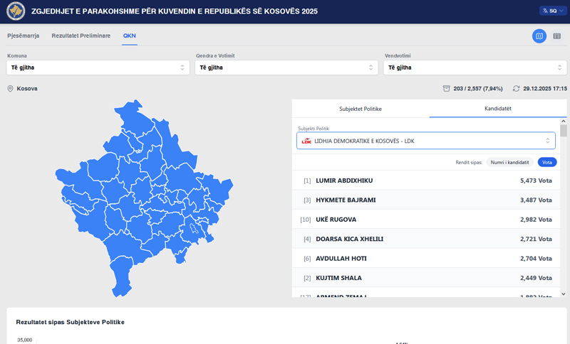 Lidhja Demokratike e Kosovës, e cila në procesimin e votave totale 99,92% aktualisht ka 13.57%, ndërsa në votat e para të kandidatëve për deputet, Lumir Abdixhiku deri tani ka marrë 5 mijë e 058 vota.