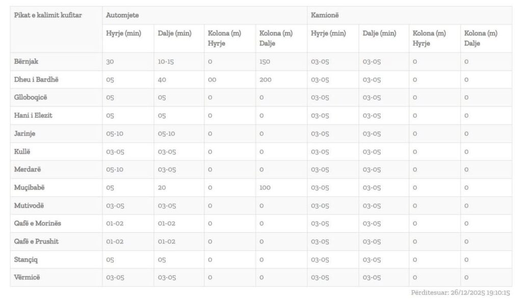 Në faqen e Ministrisë së Punëve të Brendshme janë përditësuar të dhënat për situatën në pikat kufitare të Kosovës. Aty tregohet se pritjet më të gjata janë në Bërnjak, rreth 30 minuta.