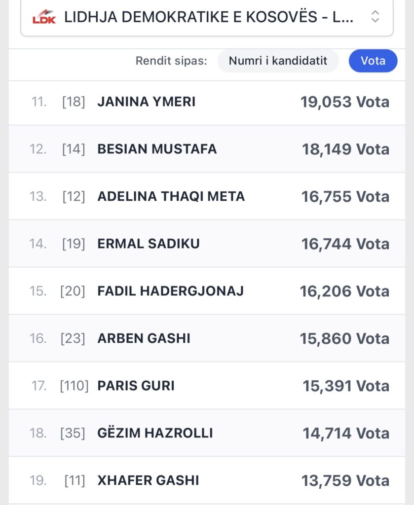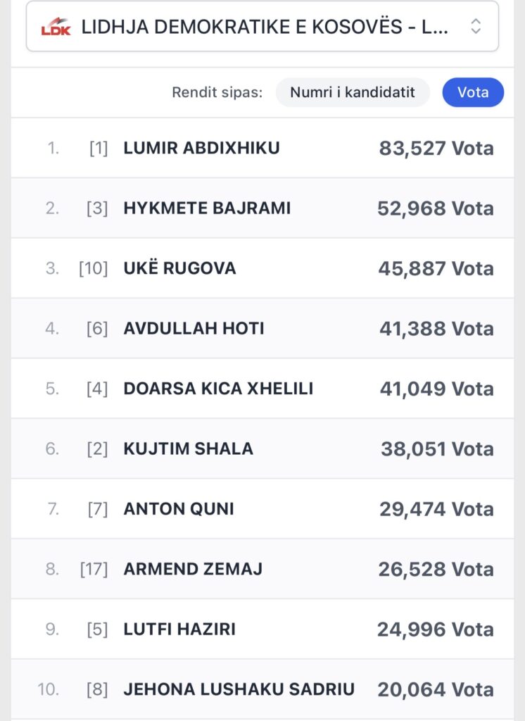 Sipas rezultateve përfundimtare, janë publikuar emrat e 19 kandidatëve më të votuar të Lidhja Demokratike të Kosovës (LDK), të cilët kanë marrë mbështetjen më të madhe nga votuesit e kësaj partie.