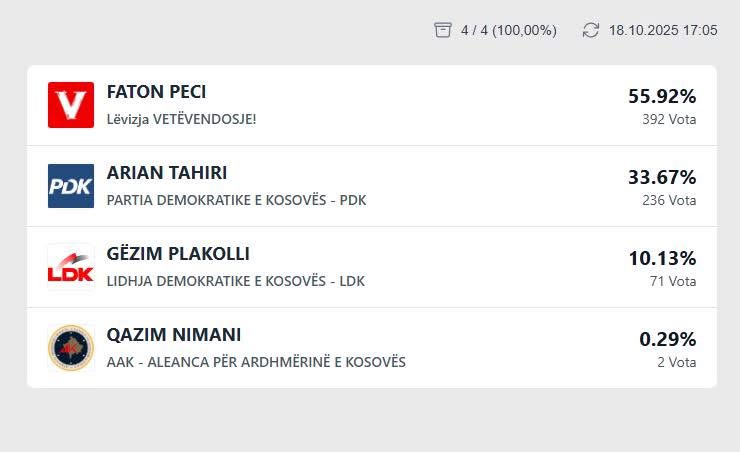 Janë numëruar 100 për qind e votave me postë për komunën e Mitrovicës. Nga votat e numëruara prin Faton Peci i VV-së me 392 vota apo 55.92 për qind.