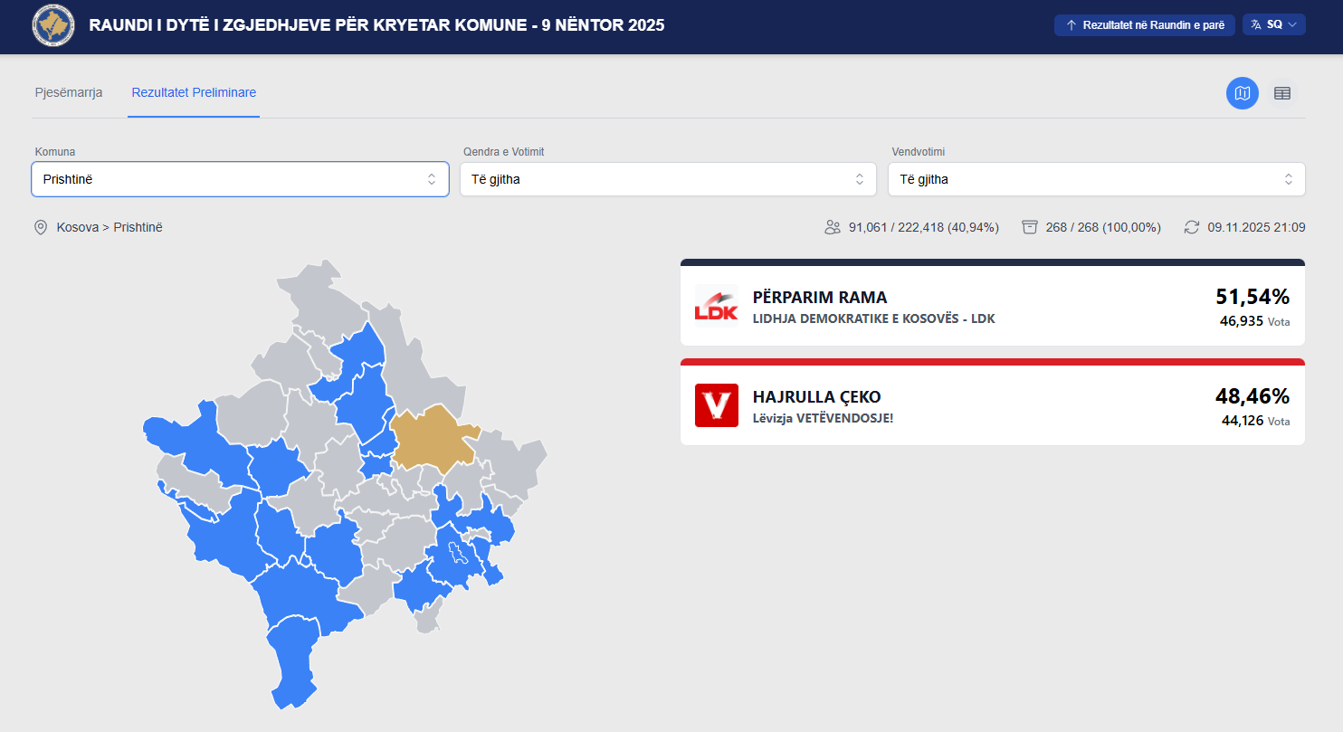 Përfundon numërimi i votave në Prishtinë: Përparim Rama 51.54%, Hajrulla Çeku 48.46%
