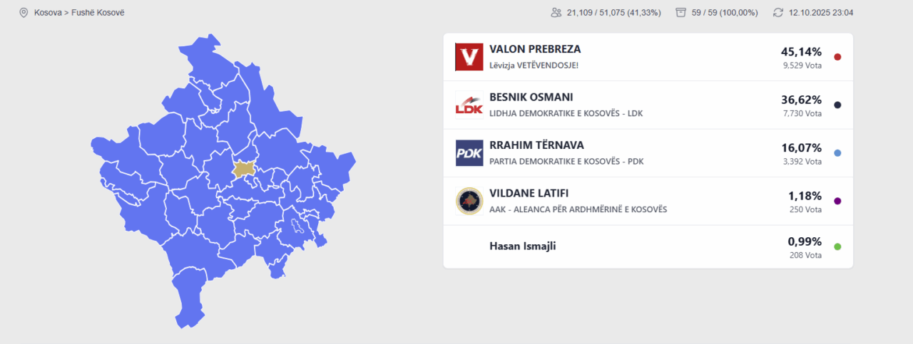 Kandidati i VV-së Valon Prebreza ka arritur të marrë 45,14%, ndërsa ai i LDK-së, Besnik Osmani 36,62%.