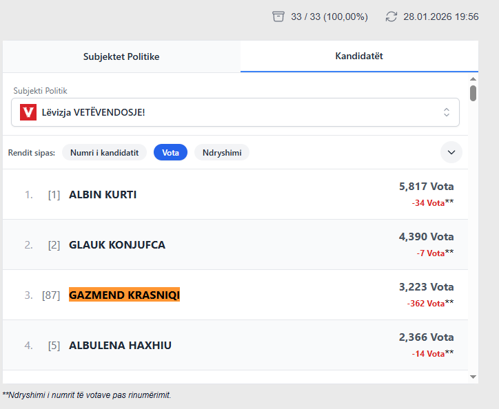 Me më së shumti vota minus ka dalë Gazmend Krasniqi, kandidat për deputet nga Vetëvendosja.