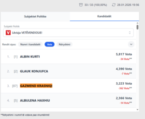 gazmend 28 janar 2026 | 20:46 Lajme të sponsorizuara Të Fundit 28 janar21:27 Hoti e konsideron të kryer dorëheqjen e Abdixhikut: Ai veç do ta njoftojë, jo të kërkojë votëbesim 28 janar21:22 Cakolli i reagon Dimal Bashës: Fjalën e fundit për interpretimin e Kushtetutës e ka Gjykata Kushtetuese jo Kryetari i Kuvendit 28 janar21:19 Ish-drejtori i ATK-së Murtezaj pasqyron rritjen e varfërisë së qytetarëve: Borxhi është dyfishuar 28 janar20:54 “Ora e fundit e botës” më afër se kurrë: shkencëtarët e vendosin vetëm 85 sekonda para mesnatës 28 janar20:49 Gati 2 milionë njerëz kanë humbur jetën, janë plagosur ose janë zhdukur në katër vitet e luftës në Ukrainë 28 janar20:46 Përfundon rinumërimi në Obiliq, kandidati i VV-së prin me vota të vjedhura