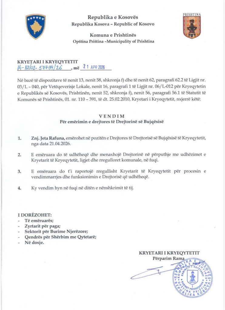 Kryetari i Komunës së Prishtinës, Përparim Rama, ka njoftuar se Jeta Rafuna nga sot është emëruar Drejtoreshë e Bujqësisë në Kryeqytet.