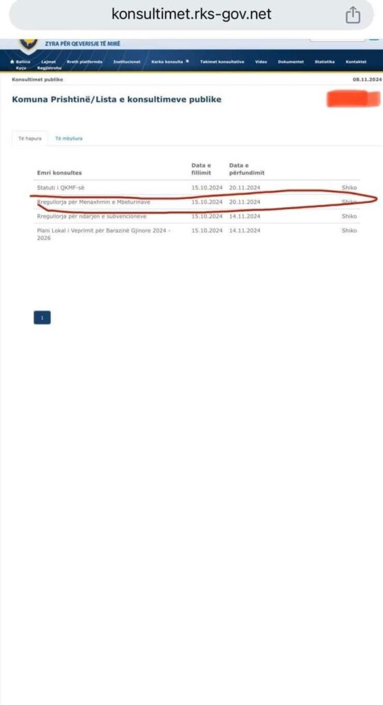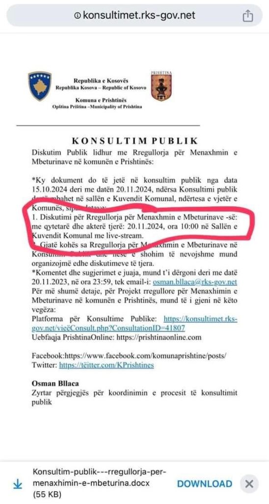 Po ashtu, kërkoj nga zyra e Kuvendit Komunal t’i sigurojë kushtet për mbajtjen e konsultimit publik me qytetarë. Pasi nuk ka njoftim zyrtar për fshirjen pa të drejtë të njoftimit, takimi me qytetarët lidhur me këtë Rregullore do të mbahet më 20 nëntor 2024, në orën 10:00, ashtu siç ka qenë e përcaktuar në dokumentin e konsultimit të publikuar në platformë.