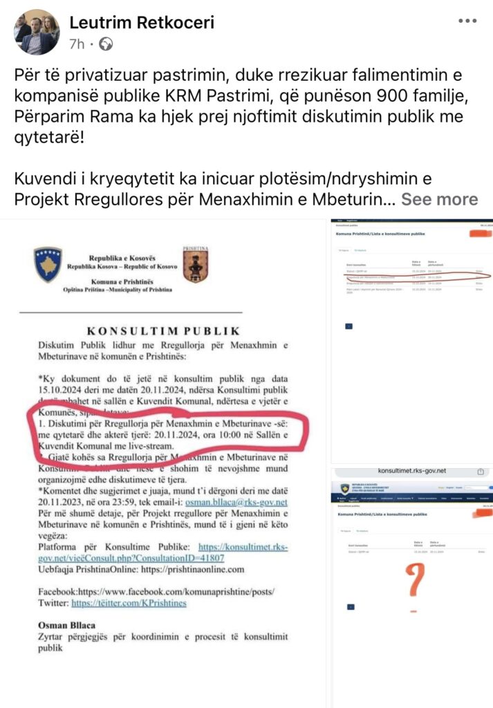 Shefi i grupit të asambleistëve të PDK-së në kuvendin komunal të Prishtinës, Leutrim Ratkoceri ka reaguar rreth vendimit të kryetarit të komunës së Prishtinës, Përparim Rama i cili pasi kishte publikuar njoftimin për diskutimin publik me qytetarë, që duhet mbajtur, (sot) me datë 20 nëntor 2024, ai ka hequr nga platforma e njoftimeve duke u munduar ta privatizoj Ndërmarrjen e Pastrimit.