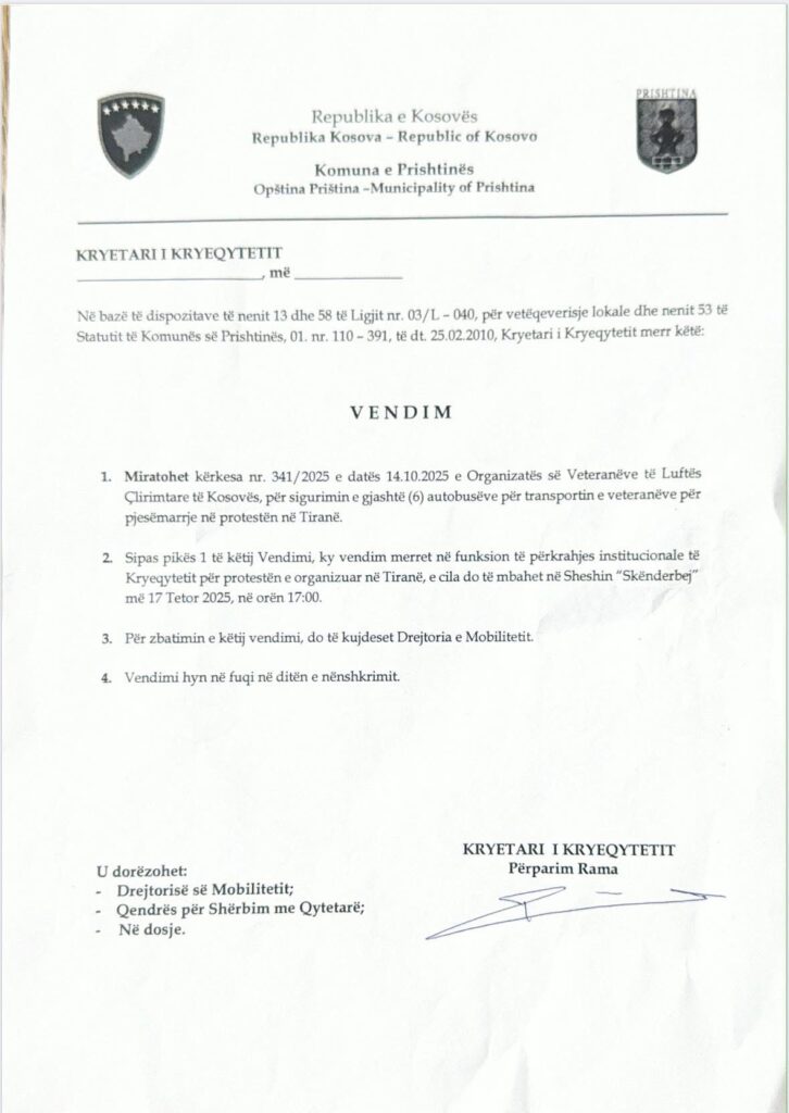Kryetari i Prishtinës, Përparim Rama, ka njoftuar se ka nënshkruar vendimin për të siguruar transportin për veteranët e Ushtrisë Çlirimtare të Kosovës që do të marrin pjesë në protestën gjithëkombëtare më 17 tetor në Tiranë.