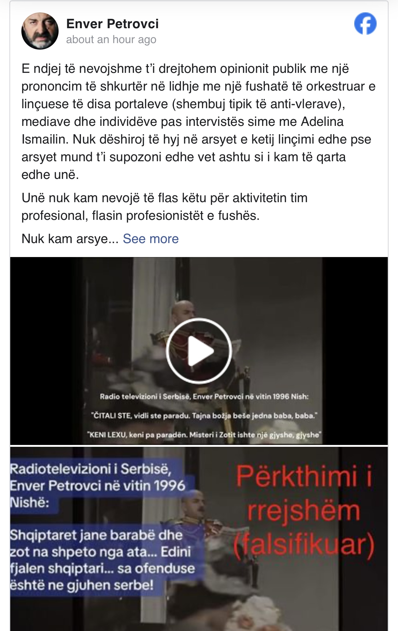 E ndjej të nevojshme t’i drejtohem opinionit publik me një prononcim të shkurtër në lidhje me një fushatë të orkestruar e linçuese të disa portaleve (shembuj tipik të anti-vlerave), mediave dhe individëve pas intervistës sime me Adelina Ismailin. Nuk dëshiroj të hyj në arsyet e ketij linçimi edhe pse arsyet mund t’i supozoni edhe vet ashtu si i kam të qarta edhe unë.
