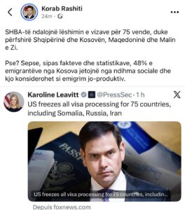 Pezullimi i vizave nga ShBA, Rashiti: Kosovarët jetojnë me ndihma sociale dhe kjo konsiderohet emigrim jo-produktiv