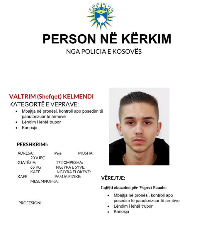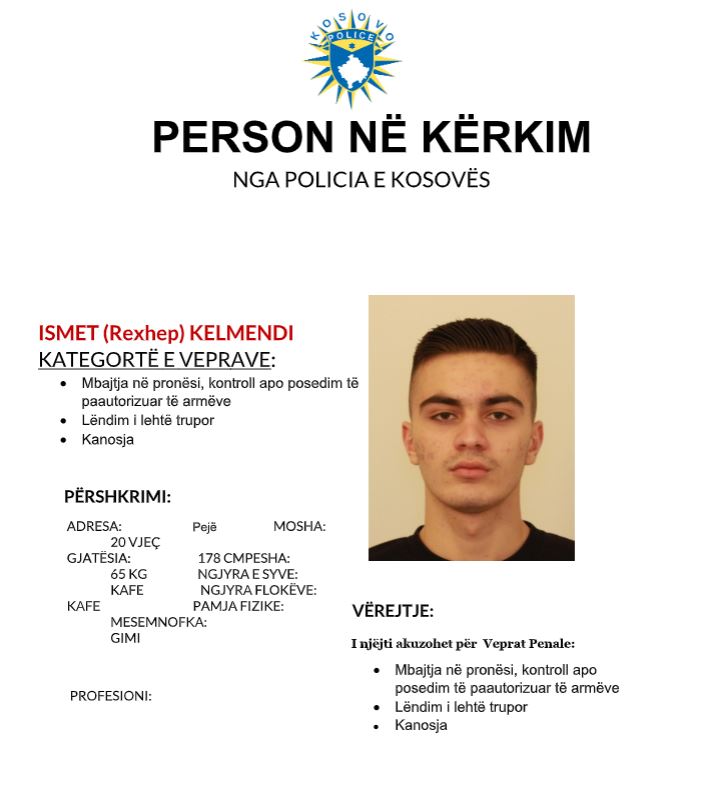 Përmes një komunikate për media, Policia bën të ditur se të shpallurit në kërkim për këto vepra janë: Ismet Kelmendi, Valtrim Kelmendi dhe Premton Berisha, të tre të moshës 20-vjeçare.