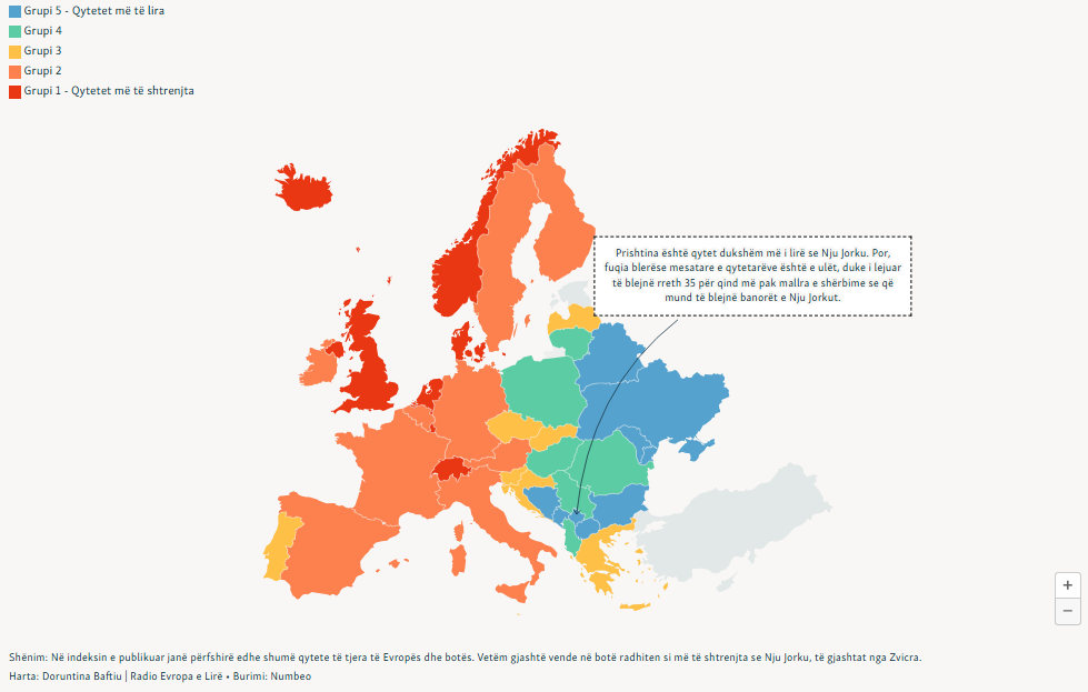 Prishtina renditet si kryeqyteti më i lirë në Evropë sa i përket kostos së jetesës, qirave, çmimeve të ushqimeve dhe në restorante. Megjithatë, edhe fuqia blerëse është ndër më të ulëtat, duke lënë prapa vetëm Athinën, Shkupin, Beogradin, Lisbonën, Kievin, Kishinjevin dhe Tiranën.