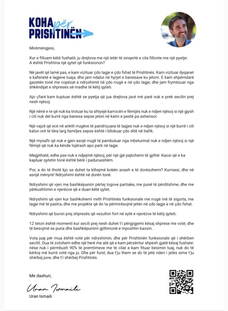 Fushata e Uran Ismailit është veçuar për qasjen e saj të afërt me qytetarët, dhe sot, në ditën e fundit para zgjedhjeve, ajo u përmbyll po ashtu siç kishte nisur – me një letër dërguar në çdo shtëpi të Prishtinës.