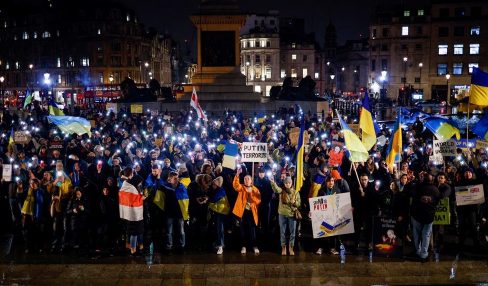 Turma qytetarësh janë mbledhur në sheshin “Trafalgar”, me flamuj ukrainas e pankarta me slogane të ndryshme.
