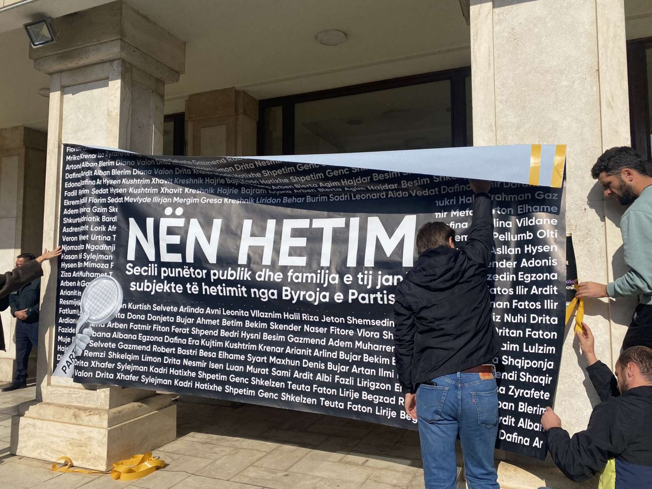 Ata kanë vendosur para hyrjes së Kuvendit një pankartë me mbishkrimin: “Secili punëtor publik dhe familja e tij janë subjekt i hetimit nga Byroja e Partisë”.