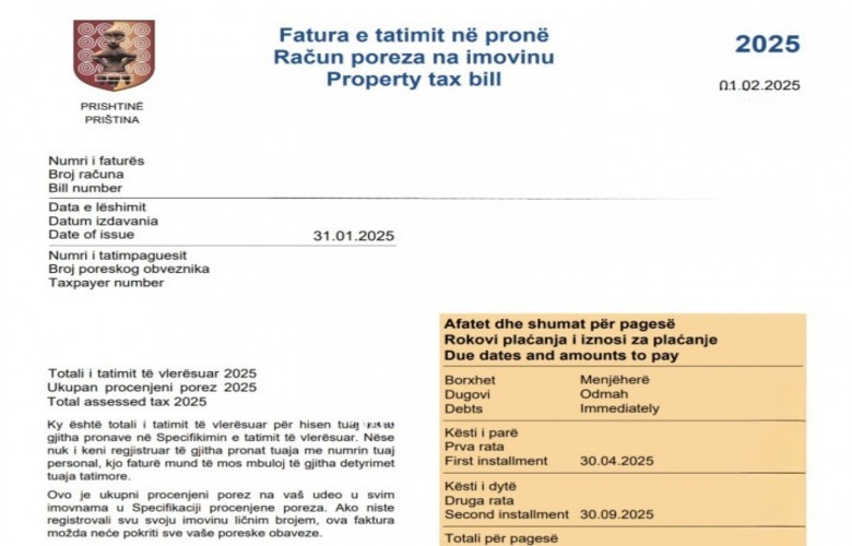 Janë publikuar faturat e tatimit në pronë për vitin 2025.
