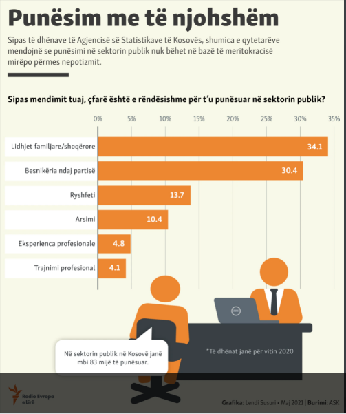 Në sektorin publik në Kosovë janë mbi 83 mijë të punësuar e, sipas një infografike të publikuar nga REL, 34.1 për qind e qytetarëve mendojnë se për t’u punësuar në sektorin publik janë të rëndësishme lidhjet familjare/shoqërore, 30.4 përqind thonë besnikëria ndaj partisë, derisa 13.7 për qind ryshfeti.