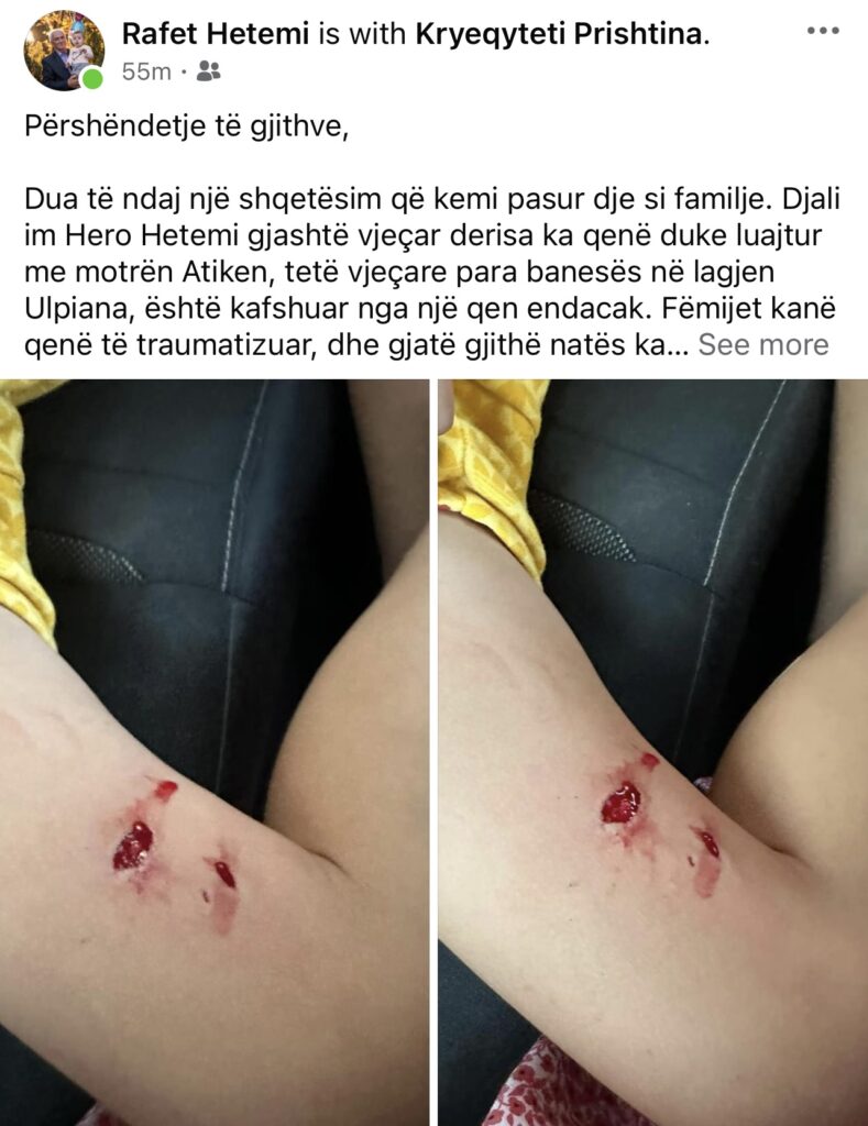 “Dua të ndaj një shqetësim që kemi pasur dje si familje. Djali im Hero Hetemi gjashtë vjeçar derisa ka qenë duke luajtur me motrën Atiken, tetë vjeçare para banesës në lagjen Ulpiana, është kafshuar nga një qen endacak. Fëmijet kanë qenë të traumatizuar, dhe gjatë gjithë natës kanë pasur ankth. Organet përgjegjëse të marrin masa sa më parë, që raste të tilla mos të përseritën”, ka shkruar Rafet Hetemi në profilin e tij në “Facebook”.
