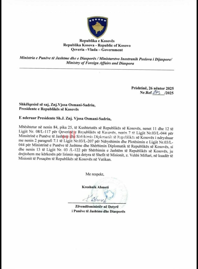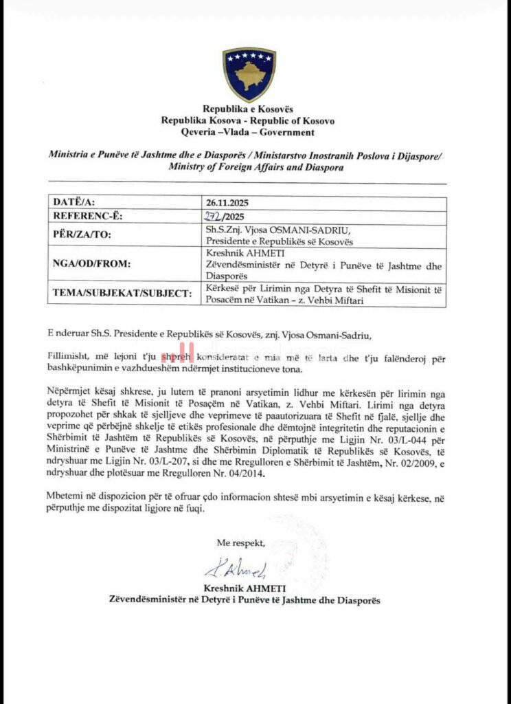 Nëpërmjet kësaj shkrese, ju lutem të pranoni arsyetimin lidhur me kërkesën për lirimin nga detyra të Shefit të Misionit të Posaçëm në Vatikan, z. Vehbi Miftari. Lirimi nga detyra propozohet për shkak të sjelljeve dhe veprimeve të paautorizuara të Shefit në fjalë, sjellje dhe veprime që përbëjnë shkelje të etikës profesionale dhe dëmtojnë integritetin e Shërbimit të Jashtëm të Republikës së Kosovës, në përputhje me Ligjin Nr. 03/L-044 për Ministrinë e Punëve të Jashtme dhe Shërbimin Diplomatik të Republikës së Kosovës, të ndryshuar me Ligjin Nr. 03/L-207, si dhe me Rregulloren e Shërbimit të Jashtëm, Nr. 02/2009, e ndryshuar dhe plotësuar me Rregulloren Nr. 04/2014. Mbete mi në dispozicion për të ofruar çdo informacion shtesë mbi arsyetimin e kësaj kërkese, në përputhje me dispozitat ligjore në fuqi.