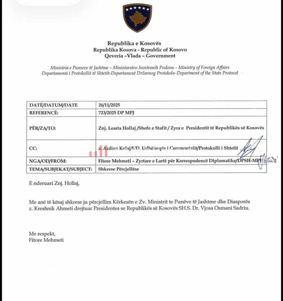 Kërkesa është nënshkruar nga zëvendësministri në detyrë i Punëve të Jashtme dhe Diasporës, Kreshnik Ahmeti, i cili pretendon se Miftari ka kryer “veprime të paautorizuara”, “sjellje të papranueshme” dhe “shkelje të etikës profesionale”, të cilat sipas MPJD-së dëmtojnë integritetin e shërbimit të jashtëm të shtetit.