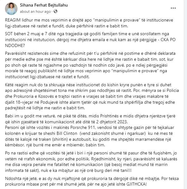 Pavarësisht rezistencës sime dhe refuzimit për t’u përfshirë në postime e dhënë deklarata për medie edhe pse më është kërkuar disa here në lidhje me rastin e babait tim, sot, kur po shoh që raste të ngjashme po vazhdojn të nodhin cdo javë, po e ndiej përgjegjësi morale të reagoj publikisht në lidhje mos veprimin apo “manipulimin e provave” nga institucionet ligj-zbatuese në rastet e fundit.