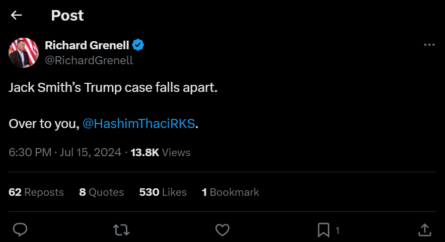 Grenell ka thënë se rasti i Jack Smith kundër Trumpit është rrëzuar, duke shtuar se radha është që të rrëzohet edhe rasti ndaj ish-presidentit të Kosovës, Hashim Thaçin, i cili ë po mbahet në paraburgim nga Gjykata Speciale që nga viti 2020, shkruan Reporteri.
