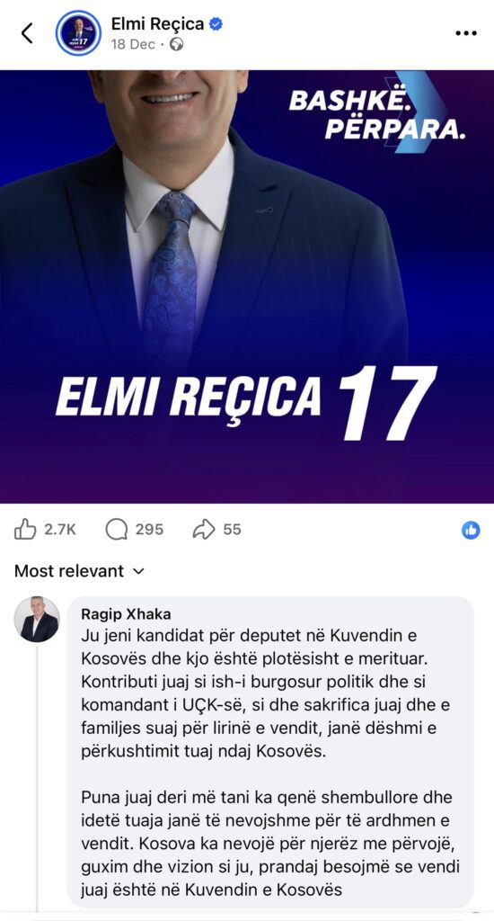 Ragip Xhaka mbështet Elmi Reçicën, kandidat nr. 17 për deputet