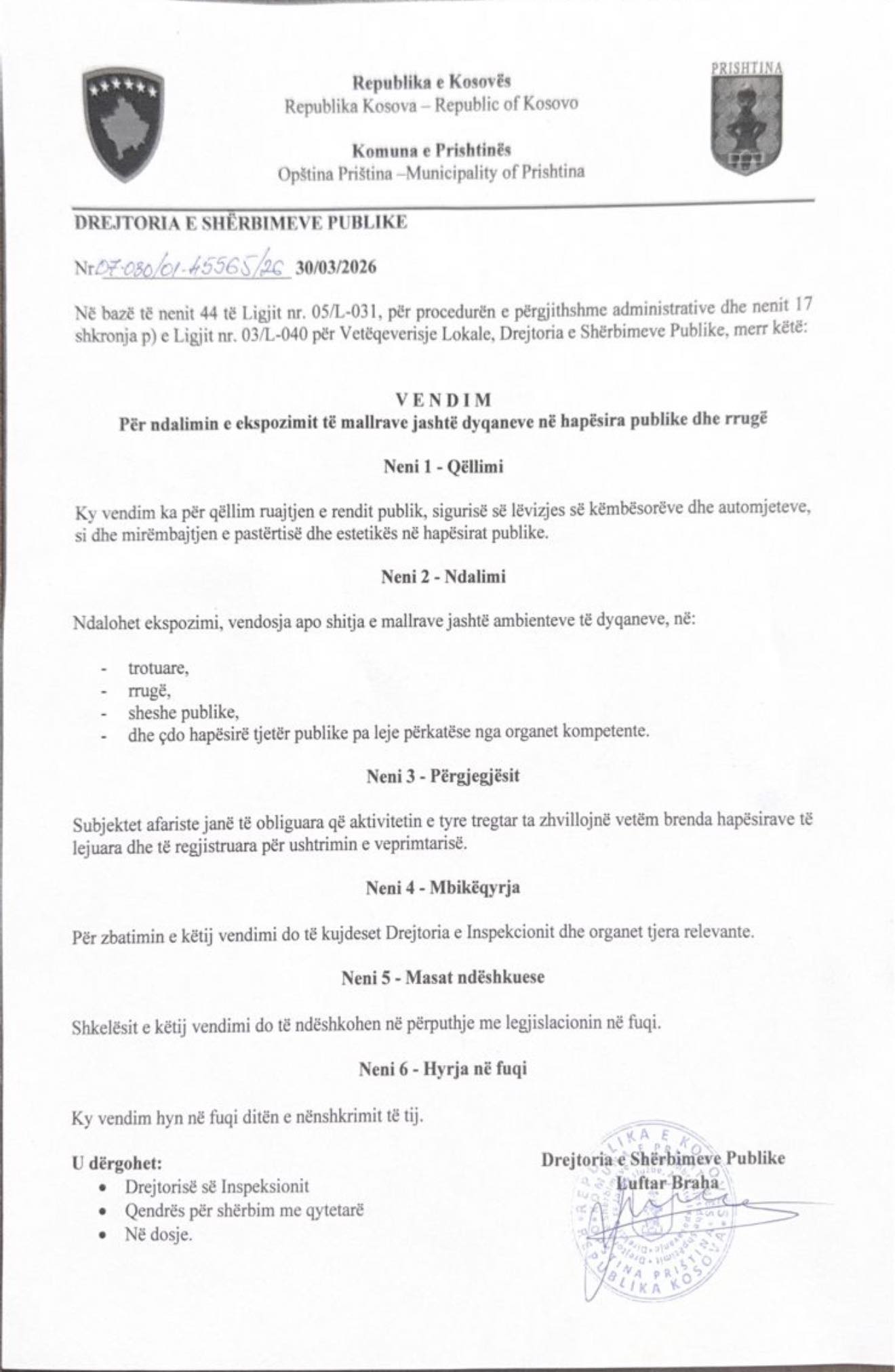 Kryetari i Prishtinës, Përparim Rama, ka marrë vendim për ndalimin e ekspozimit të mallrave në hapësira publike dhe në rrugë.