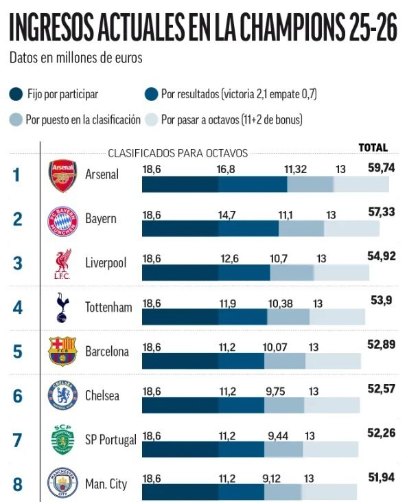 Sa i përket klubeve të mëdha spanjolle, Barcelona ka fituar 52.89 milionë euro deri më sot dhe është e vetmja që është kualifikuar direkt për raundin e 1/8-tës. Pas humbjes së tyre në ndeshjen e fundit dhe rënies nga tetë vendet e para, Real Madrid ka grumbulluar 37.93 milionë euro.