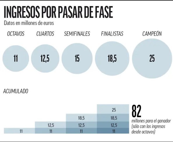 Kësaj shume duhet t’i shtohen 18.62 milionë euro të marra nga secili prej 36 pjesëmarrësve në këtë fazë, si dhe 11 milionë euro të siguruara tashmë nga Topçinjtë për arritjen në fazën e 1/8-tës, së bashku me një bonus shtesë prej 2 milionë eurosh për tetë ekipet e para që kualifikohen direkt.