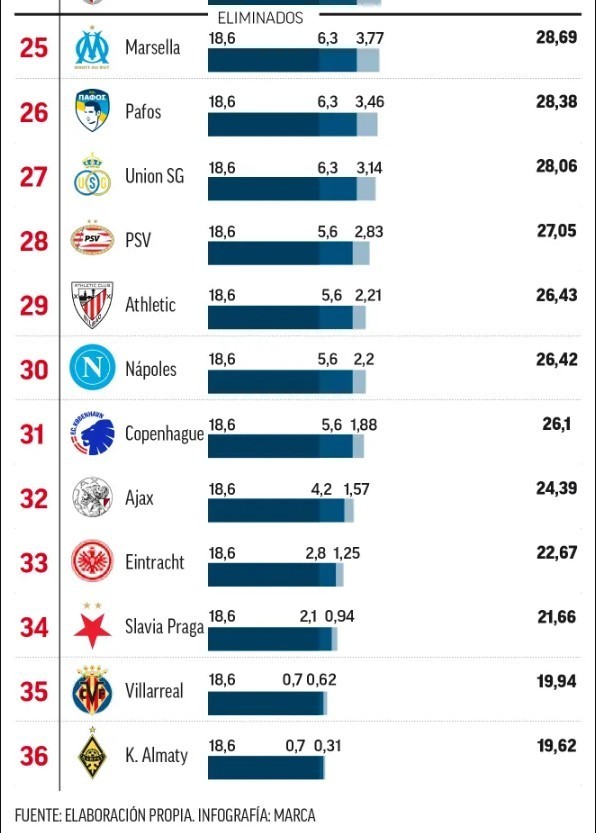 Në këtë grup futen edhe klube si Atletico Madridi (34.9 milionë euro), Atalanta (34.6 milionë euro) dhe Bayer Leverkusen (33.6 milionë euro), që tregojnë se suksesi sportiv reflektohet drejtpërdrejt në të ardhura.