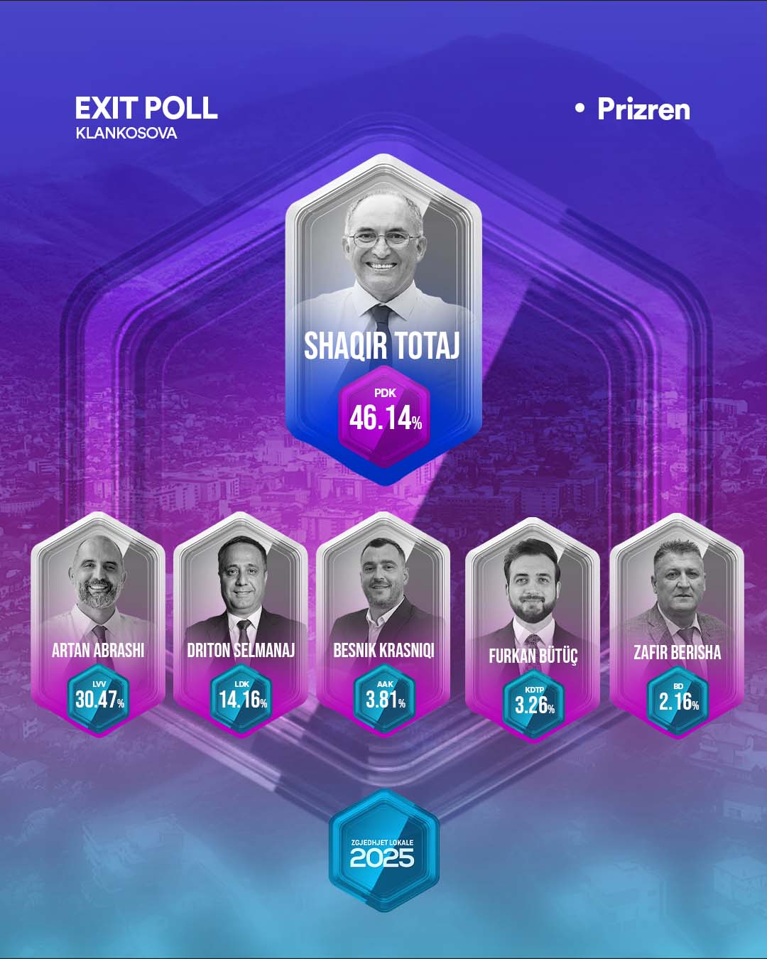 Rezultatet për Prizrenin: Exit Poll-i i Klan Kosovës e nxjerrë Totajn me 46.14% 12 tetor 2025 | 19:18 Lajme të sponsorizuara Të Fundit 12 tetor19:20 Exit-Polli i Klan Kosova për Gjilanin: LVV dhe LDK në balotazh 12 tetor19:19 Exit Polli i T7: Podujeva shkon në balotazh, këto janë rezultatet 12 tetor19:18 Rezultatet për Prizrenin: Exit Poll-i i Klan Kosovës e nxjerrë Totajn me 46.14% 12 tetor19:16 Exit-Polli i Klan Kosova: Gjini, plus katër 12 tetor19:16 Imri Ahmeti fiton pa balotazh në Lipjan, sipas Exit Poll-it në T7 12 tetor19:13 Exit Poll-i i Klan Kosovës në Pejë: Gazmend Muhaxheri i pari me 47.52%