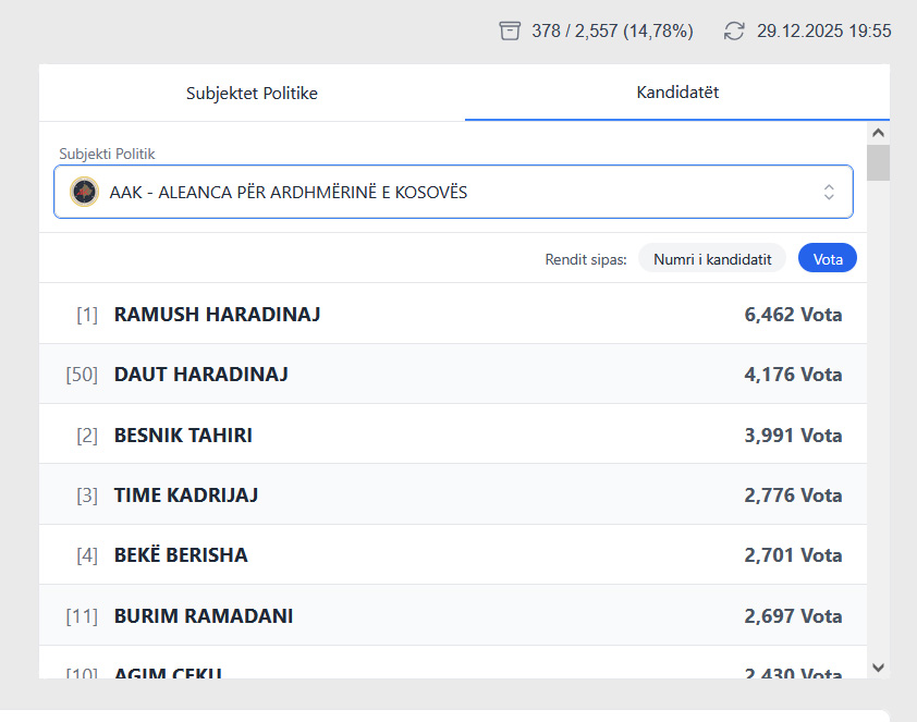 Ndërsa, numërimi i votave të kandidatëve për deputetë ka shkuar në 14,78%, rezultatet preliminare për kandidatët më të votuar të AAK-së janë si në vijim:
