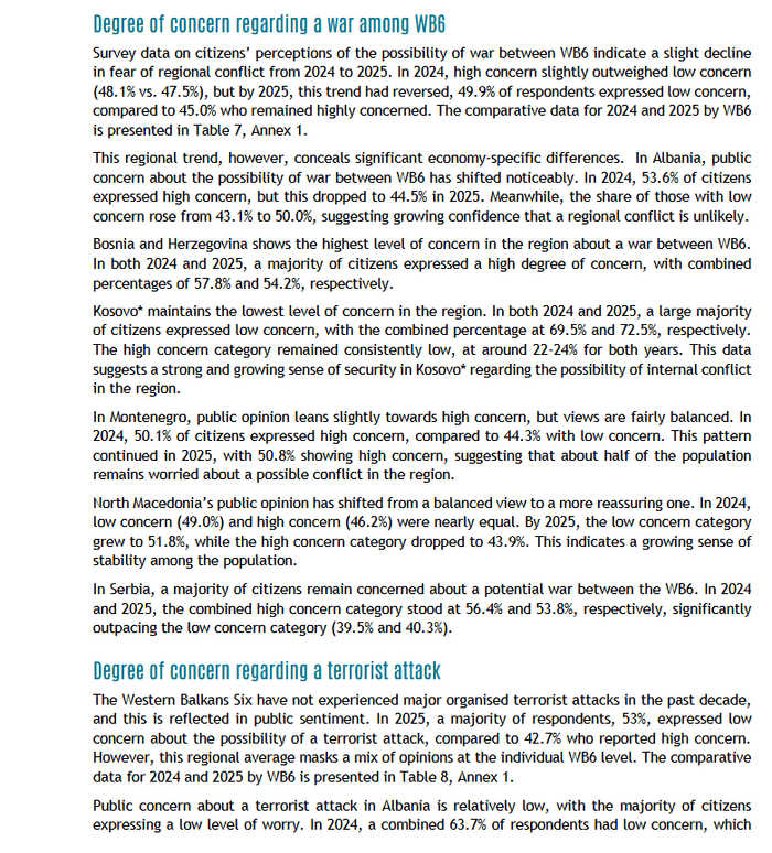 Sipas këtij raporti në vitet 2024 dhe 2025, një shumicë e madhe e qytetarëve të Kosovës kanë deklaruar shqetësim të ulët për një konflikt të mundshëm mes vendeve të rajonit, me 69.5% në vitin 2024 dhe 72.5% në vitin 2025.