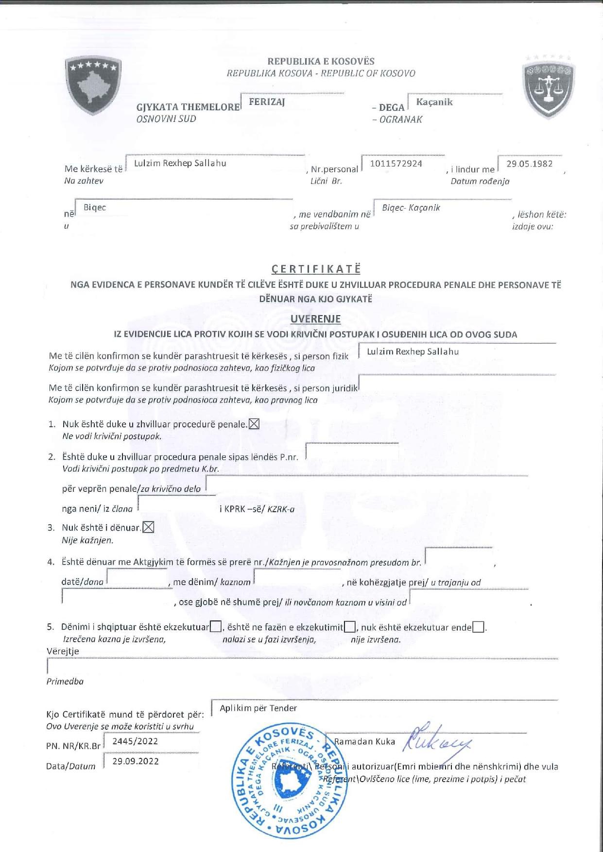 Prandaj ju bëjmë me dije se OE “Sallahu Shpk” me pronar Lulzim Sallahu, sipas Certifikatës së lëshuar nga Gjykata kompetente, nuk ka asnjë dënim dhe është plotësisht i përgjegjshëm sipas Ligjit të Prokurimit Publik, fakt ky qe dëshmohet me dokumentin si më poshtë: