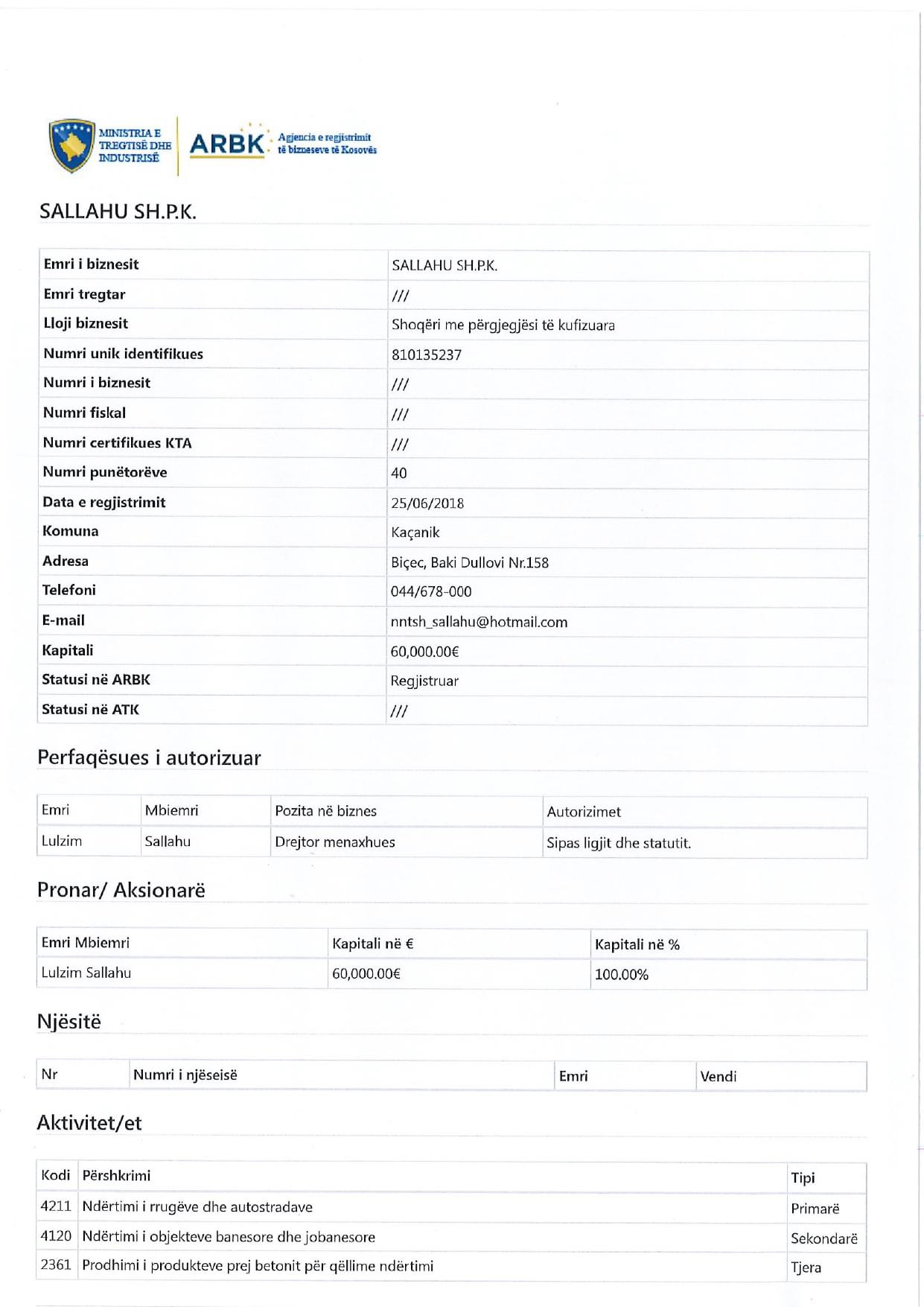 “Sallahu” me pronar Lulzim Sallahun bënë me dije opinionin se sipas Certifikatës së lëshuar nga Gjykata kompetente, nuk ka asnjë dënim dhe është plotësisht i përgjegjshëm sipas Ligjit të Prokurimit Publik, dhe këtë fakt operatorit ekonomik e dëshmon me dokumentin e leshuar nga vet gjukata kopetente.