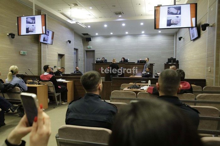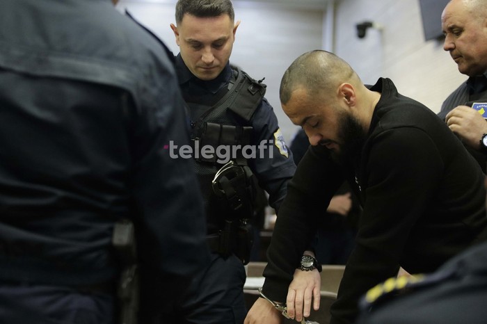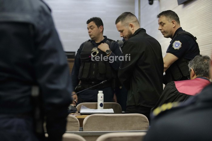 Të akuzuarit u sollën me pranga në duar në gjykatore. Para trupit gjykues është duke dëshmuar i dyshuari kryesor për këtë rast, Naim Murseli.