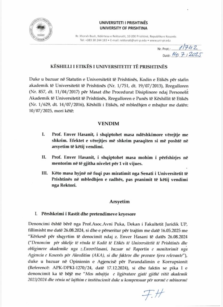 Pas pranimit të vendimit të Agjencisë për Parandalimin e Korrupsionit, të datës 23 janar 2026, Senati i Universitetit të Prishtinës, në mbledhjen e tij, miratoi vendimin e Këshillit të Etikës të datës 14 korrik 2025, duke i shqiptuar ish-rektorit Enver Hasani masa disiplinore për shkelje të rënda etike.