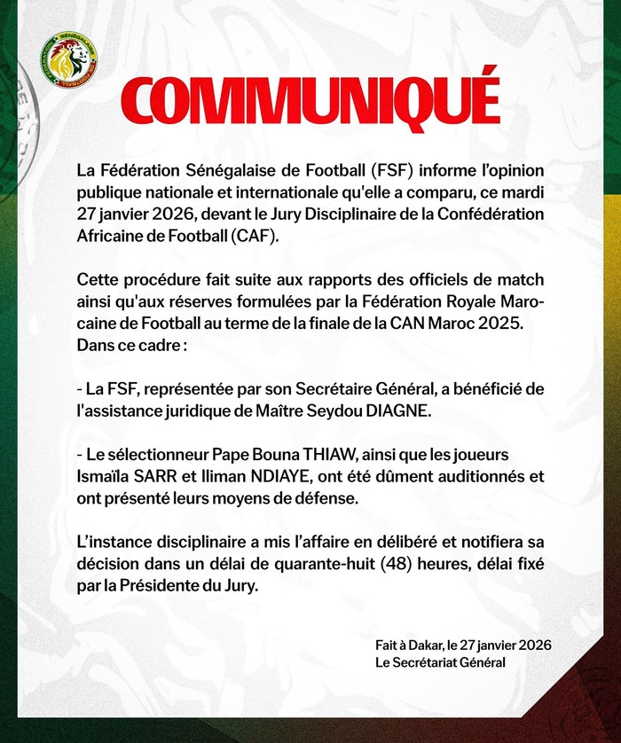 “Federata Senegaleze e Futbollit (FSF) informon publikun kombëtar dhe ndërkombëtar se u paraqit, këtë të martë, më 27 janar 2026, para Jurisë Disiplinore të Konfederatës së Futbollit Afrikan (CAF)”.
