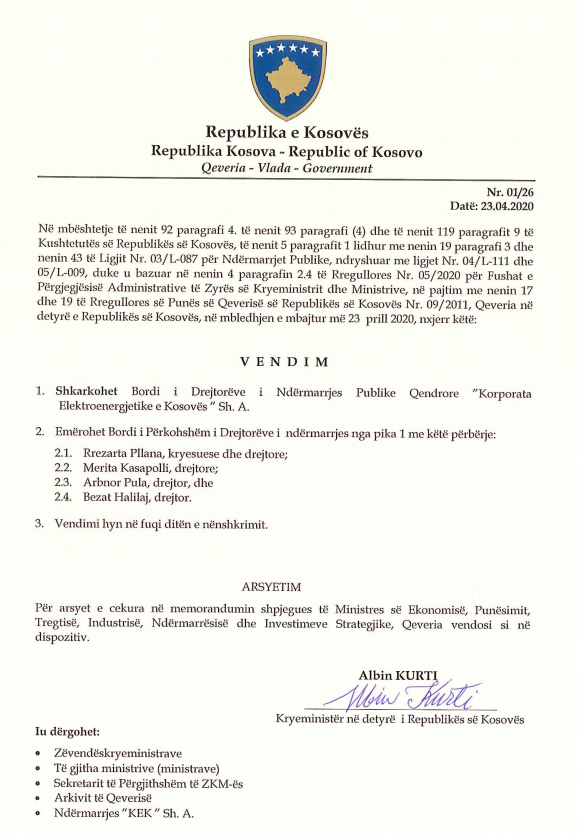 Qeveria e Kosovës në detyrë gjatë ditës së djeshme e ka shkarkuar Bordin e Drejtorëve të Korporatës Energjetike të Kosovës, në vend të cilit është emëruar Bordi i përkohshëm.