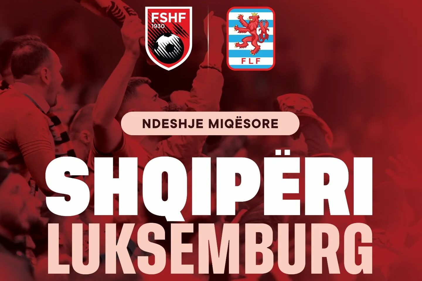 May be an image of text that says 'FSHF 1930 FLF NDESHJE MIQESORE SHOIPERI LUKSEMBURG 6 QERSHOR 2026 I ORA20:00 ORA 20:00 STADIUMI "AIR ALBANIA"- -TIRANE'