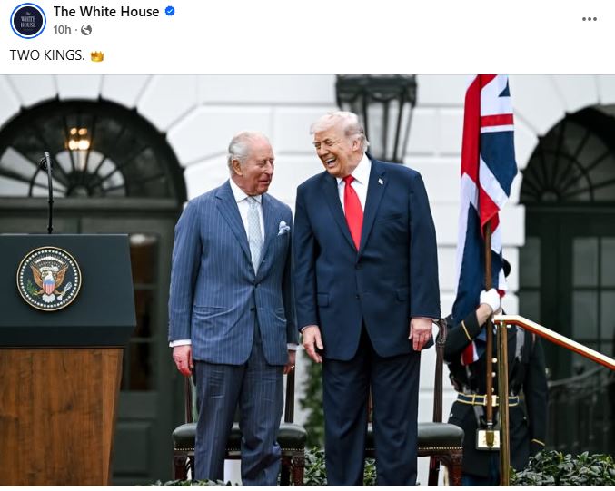 Menjëherë pasi Mbreti Çarls u largua nga takimi i tij me Donald Trump për në Kapitolin e SHBA-së, llogaria zyrtare e Shtëpisë së Bardhë X postoi një fotografi të dy burrave duke qeshur, me mbishkrimin “DY MBRETËR”.