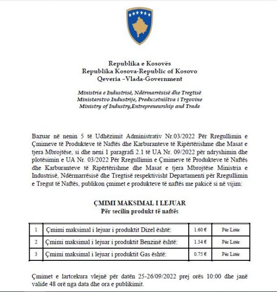 Siç njofton ministria, çmimi maksimal i lejuar për secilin produkt të naftës është si në vijim.