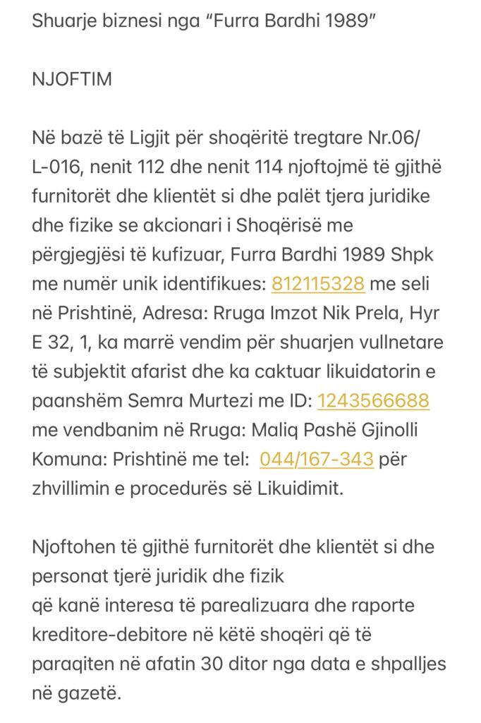 Shuarje biznesi nga “Furra Bardhi 1989” 27 tetor 2025 | 18:12 Lajme të sponsorizuara Të Fundit 27 tetor18:12 Shuarje biznesi nga “Furra Bardhi 1989” 27 tetor16:36 Shpallje e pavlefshme nga Vahide Fazliu 27 tetor16:35 Shpallje e pavlefshme nga Hidajete Ademi 27 tetor11:53 Debat Publik nga operatori “Fidani – Beton’’ Sh.p.k. 27 tetor11:46 “SVB Energy” organizon Debat Publik 27 tetor11:42 “Eris Solar” organizon Debat Publik