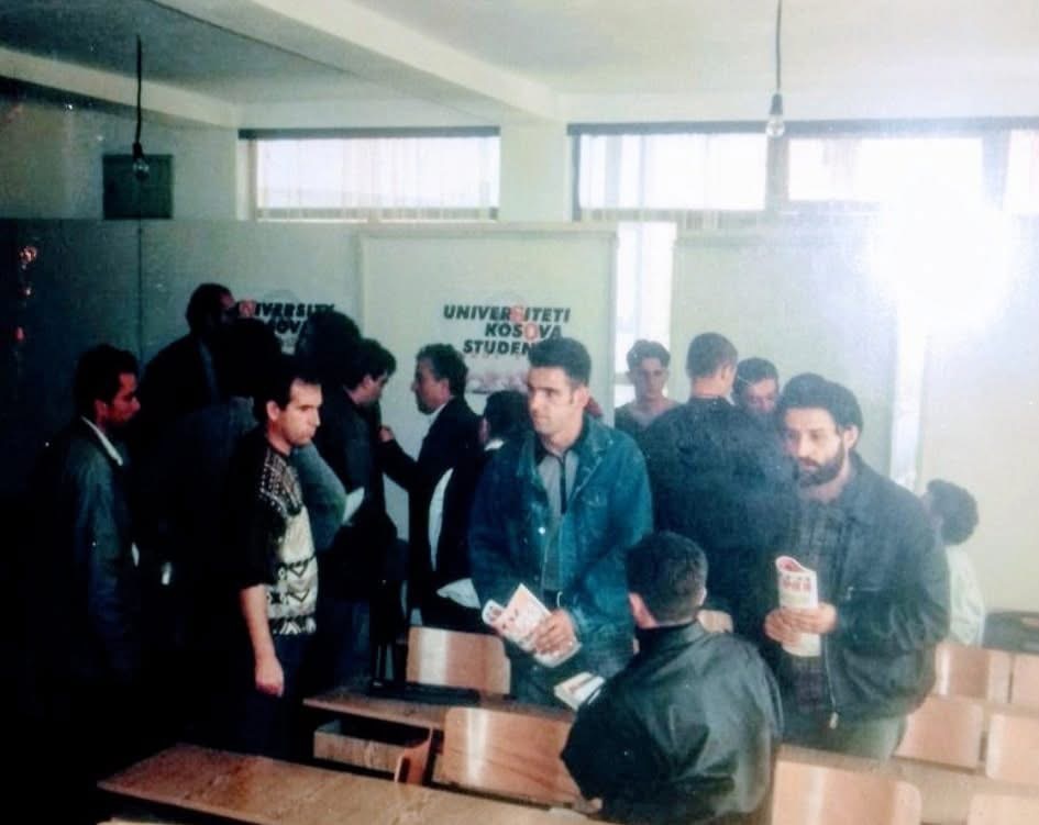 Në fotografinë e realizuar në selinë e Unionit të Pavarur të Studentëve të Kosovës (UPSUP), në Velani, jam pranë Fati Hisenit, kryetarit të studentëve të Universitetit të Tetovës, i cili ndodhet në të djathtën time, si dëshmi e përkushtimit dhe guximit tonë të përbashkët në ato ditë vendimtare për fatin e Kosovës.